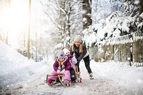 Der Roll Rodel kann wahlweise auf Schnee oder Teer genutzt werden. Die Rollen sind aus Vollgummi, laufen leise und leicht, ohne Kraftaufwand.